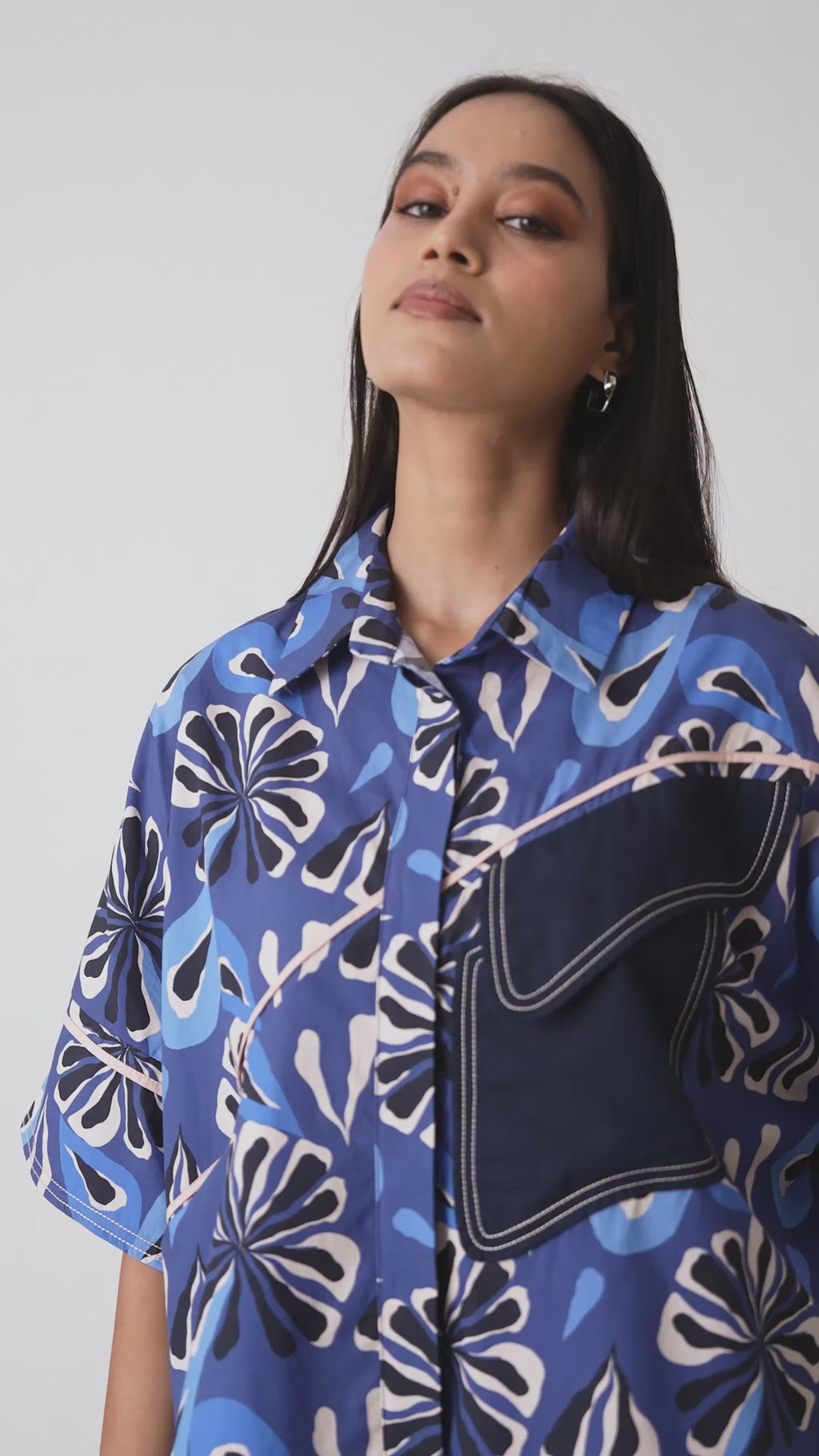 A solid color boxy shirt featuring a stylish asymmetric look with contrast color pocket at one side and anchor thread detailing all over for a modern, chic look.