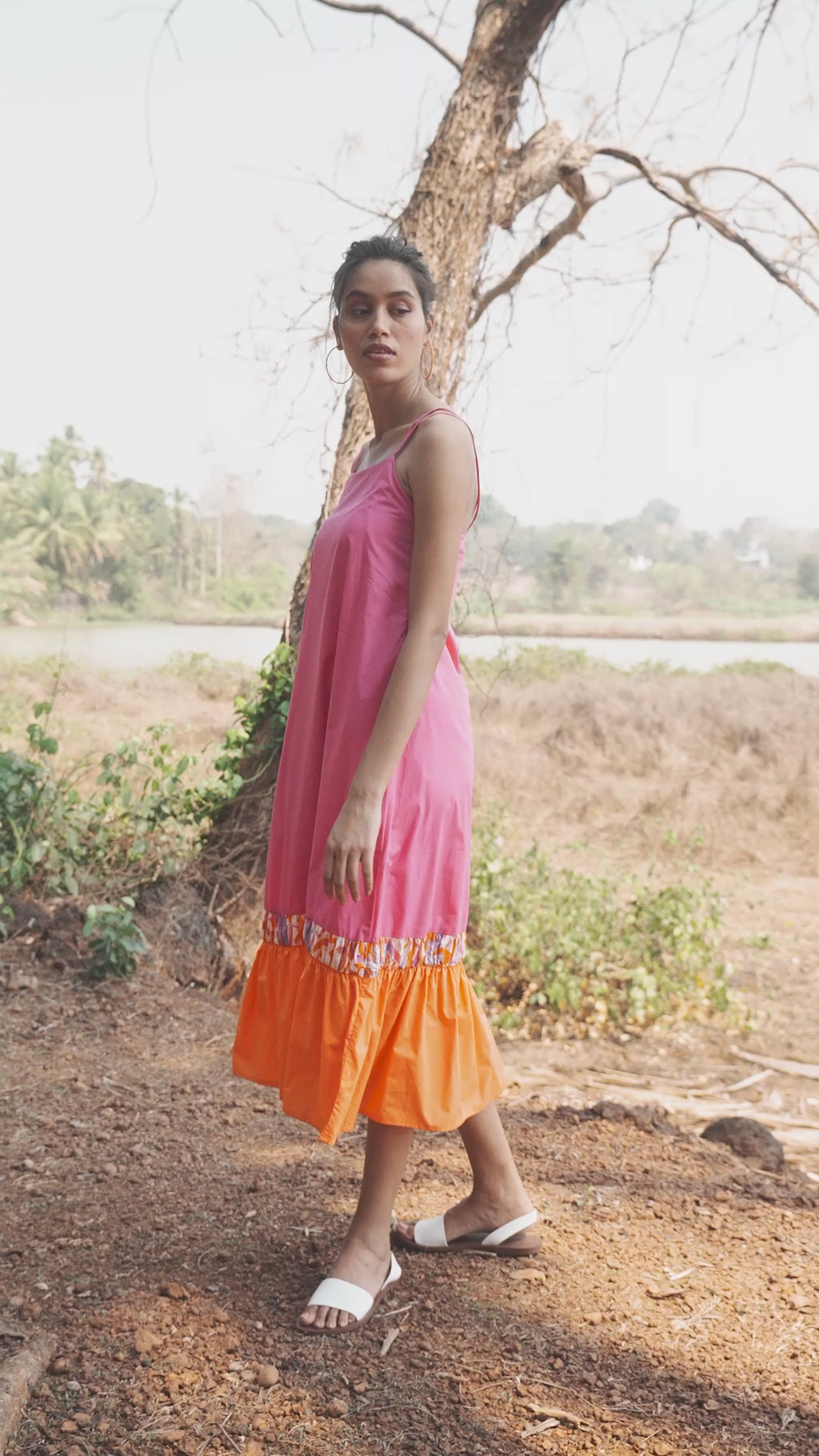 A fun and flirty, a-line spaghetti dress in Pink, with a contrast, rouched panel at the bottom in Celosia Orange, and orange tropical print trim.