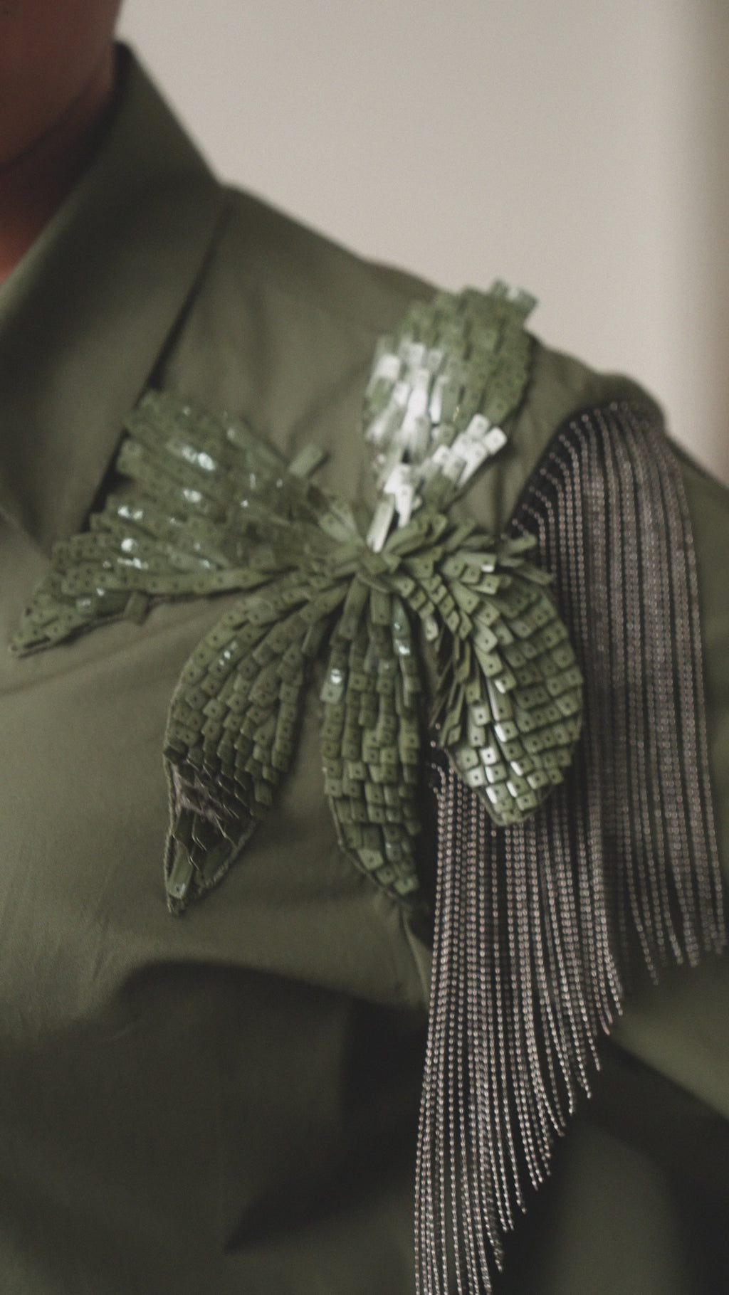 A classic button-down shirt, with elegant floral hand embroidered iris patches, 3/4th sleeves and chain fringe detail on shoulders. Perfect for elegant and semi-formal looks.