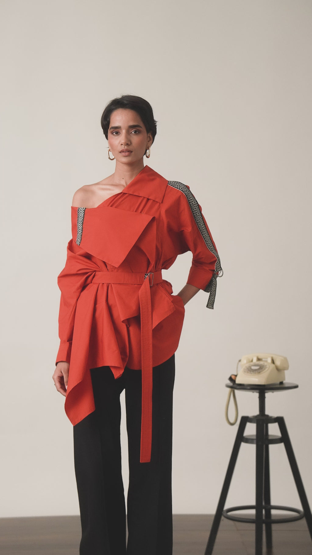 An immensely versatile shirt featuring a chic crossover collar, raglan sleeves for comfort, and asymmetric draped fabric detailing for a modern twist. Can be worn 3 different ways - as an off-shoulder shirt, as an open overlay or as a button down oversize anti-fit shirt. Comes with the belt.