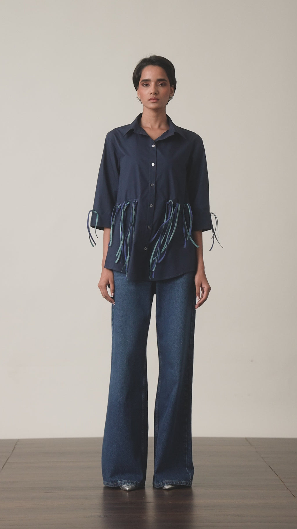 A relaxed fit button down shirt featuring with overlock fringe detailing. Perfect for casual and smart-casual looks.