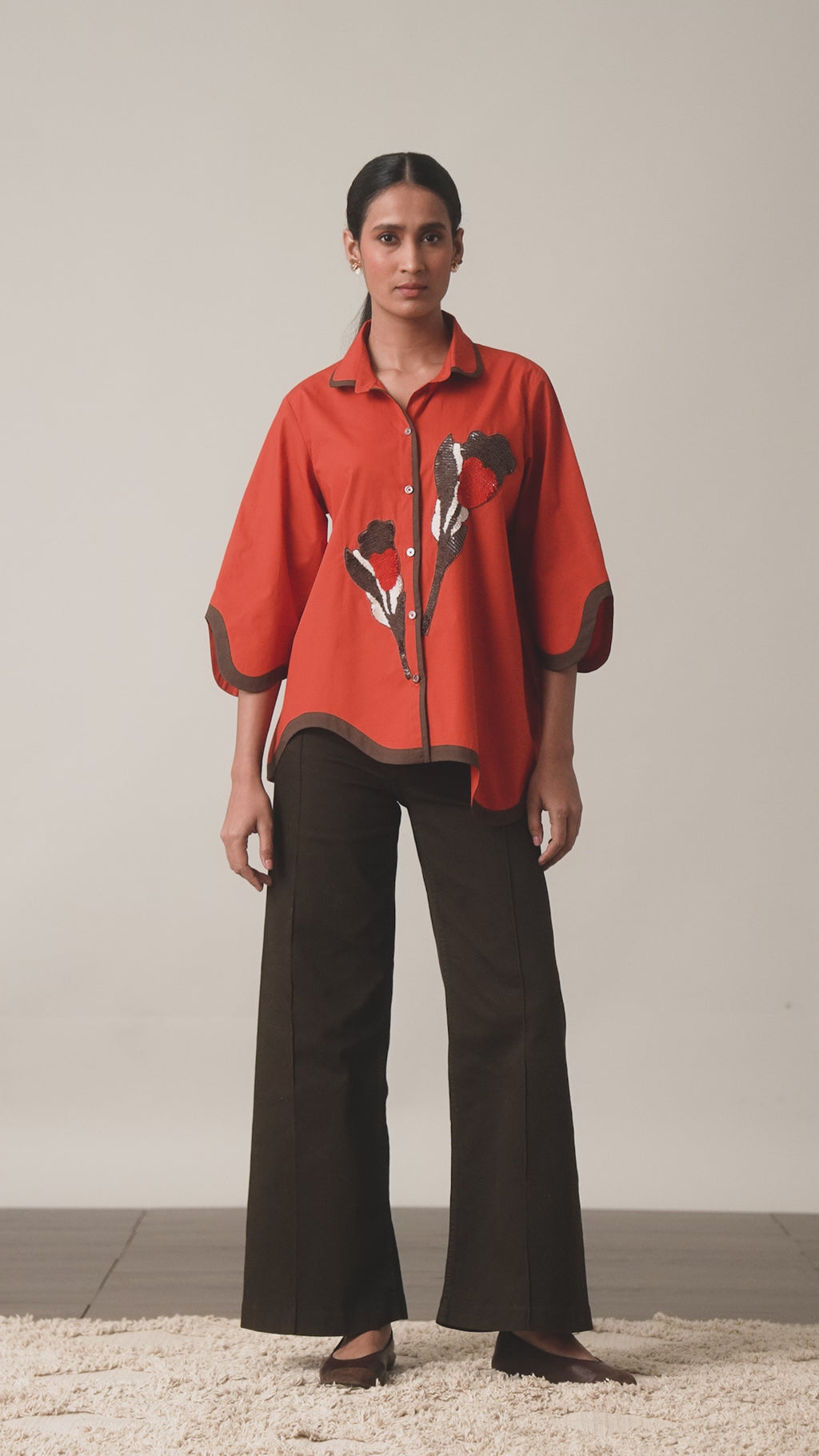 A charming button-down shirt with a wave shaped hemline and hand embroidered sequin floral patches - perfect AM to PM style.